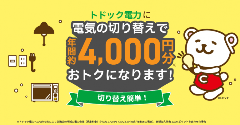 トドック電力に切替で年間約4,000円分おトクになります!家計にやさしいベーシック電気メニューと、地球にやさしい再生可能エネルギー100%メニューをご用意。解約手続きや工事不要で簡単に切…